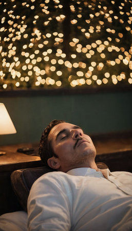 A peaceful night scene featuring a man deeply asleep, surrounded by sparkling particles that create a dreamy atmosphere, evoking feelings of tranquility and wonder.