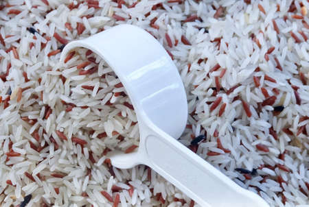 Cuisine and Food, Uncooked Brown and White Jasmine Long Rice, Basmati Rice or Thai Jasmine Rice on Measuring Spoon. High in Vitamin B3, B6, B1 and B5.