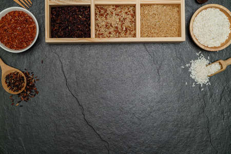 Brown rice, Black Jasmine rice, Red jasmine rice and Riceberry in boxes and bowl on black desk.
