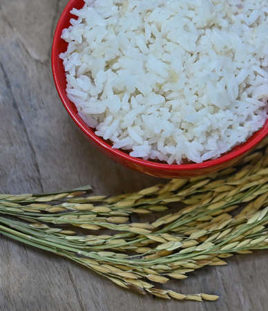 Steamed rice in a red bowl on a woodden and yellow paddy rice