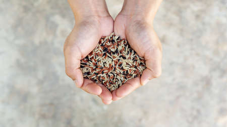Man holding organic three colors (red, black, and brown) rice on a gray background.
