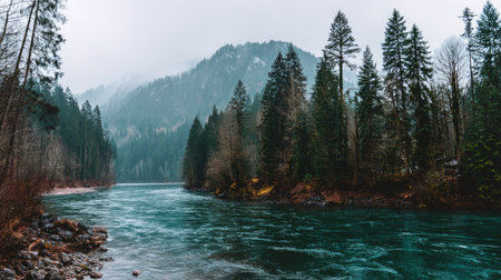 A tranquil river flows through verdant mountains, enveloped in morning mist. The serene landscape captures the essence of nature's beauty and calmness at dawn.