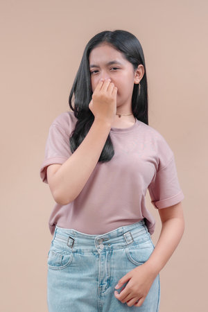 An Asian woman in a casual pink t-shirt and denim jeans covers her nose with her hand, expressing discomfort or dislike, while posing against a neutral background.