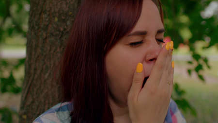 Close up of young woman yawning from fatigue near tree in parkland. Portrait of tired brunette on street in summertime