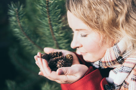 Young blonde Caucasian woman holds and smells Christmas tree pinecones in her hands