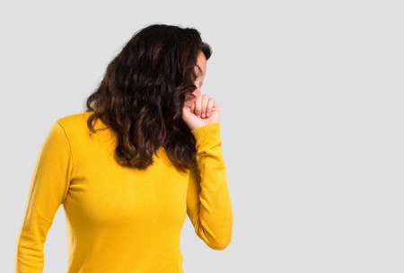 Young girl with yellow sweater and blue bandana on her head is suffering with cough and feeling bad on isolated grey background