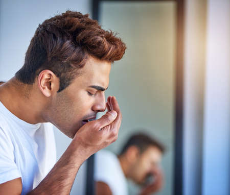 Maybe its time to switch to a different mouth wash. a handsome young man smelling his breath during his morning grooming routine.