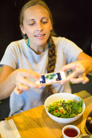 Woman using mobile phone to take pictures of food on the table. Taken on mobile and put on social networks.