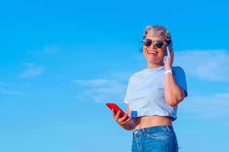 young pretty blonde woman with short hair and sunglasses laughing while listening to music with wireless headphones and smart phone