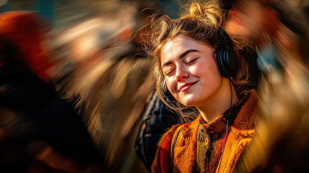 Smiling young woman in headphones with closed eyes in a midst of a blurred motion of a bustling crowd of a big city. In the bustling city, her smile shines through the chaos around her.