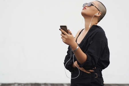 Trendy young woman wearing earphones and enjoying music in her smartphone