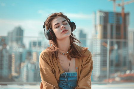 Woman wearing headphones and relaxing on rooftop