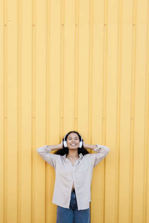 A joyful young woman is wearing vibrant yellow headphones while smiling widely. She stands in an urban environment marked by gray walls, showing her passion for music.