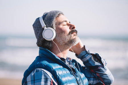 Caucasian man meditating on the beach with headphones in winter