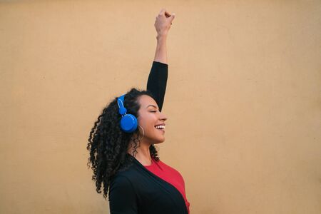 Portrait of young afro woman enjoying and listening to music with blue headphones. Technology and lifestyle concept.