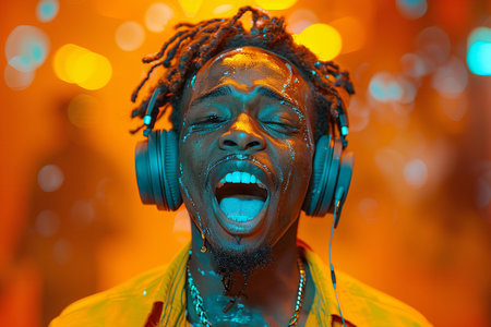 Portrait of a young african american man with afro hairstyle, wearing headphones, singing and dancing.
