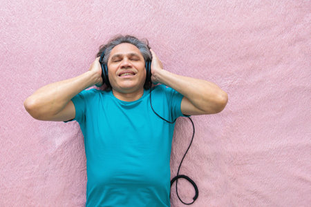 50-year-old man listens to music with headphones at home, lying on the bed. Relaxing, enjoying.