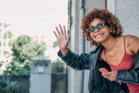 girl in the street smiling waving or drawing attention with her hand