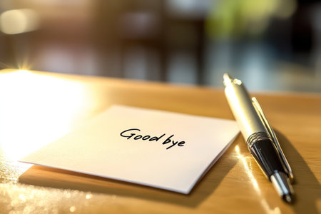 A simple Good bye message on a sticky note lies on a sun-drenched desk with a pen, symbolizing parting and closure.