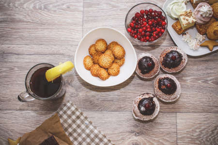 Closeup of sweets in a white plate on a light wooden table top, bowl with cookies, a cup of coffee decorated with a slice of lemon, red berries and muffins Festive pastry composition.