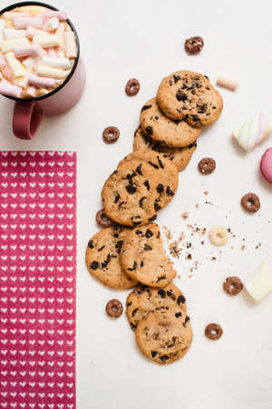 Lovely morning with latte and sweet bakery. Delicious scone with chocolate and hot drink with marshmallow on white table, top view. Love of desserts concept