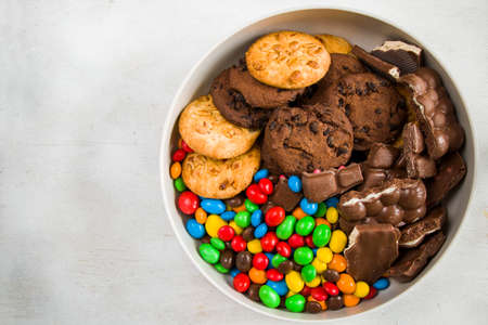 Lviv / Ukraine - April 2020: Assorted candy, cookie and chocolate wrappers left on a white table. Delicious sweets full of sugar that leads to health issues and overweight. Binge eating in isolation.