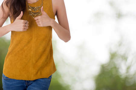 business woman show thumbs up with blur green background