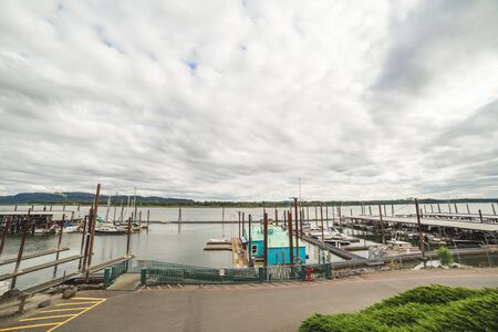 Docks on the Columbia River with clouds above.