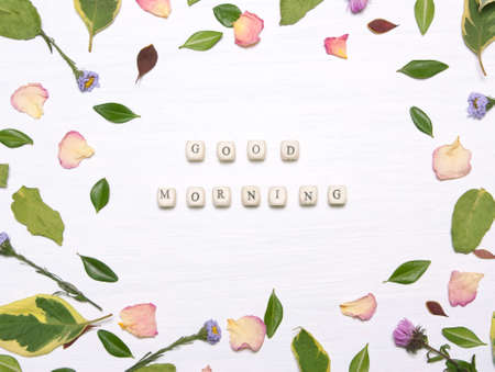 The phrase good morning on cubes in a frame of flowers, petals and green leaves on a white background.Inspirational image.Type flat, top view