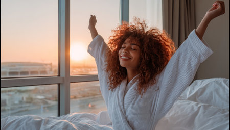 Woman in robe stretches joyfully in a bright, sunlit room overlooking a city