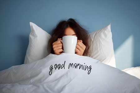 A person in bed holds a white mug over their face, text "good morning" is on the blanket