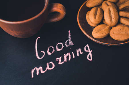 Cup of Coffee and Cookie or Biscuit on a Dark Background. Inscription Good Morning. Selective Focus. Top View.