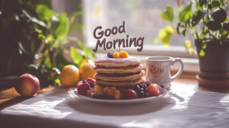 A warm and inviting scene featuring a stack of fluffy pancakes topped with fresh fruit, coffee, and a cheerful morning ambiance. Perfect for breakfast.