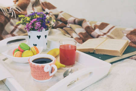 Breakfast in bed with hot coffee and macaroons. Healthy breakfast kept on bed with books and flowers Close up of a cup of coffee with cookies, fresh juice and grapefruit on wooden tray in bed. Toned