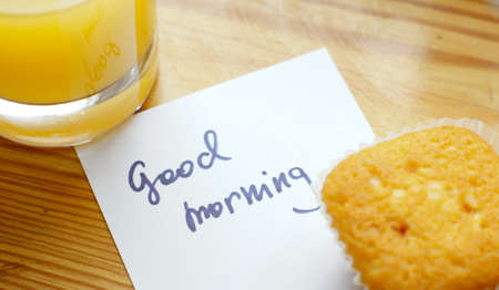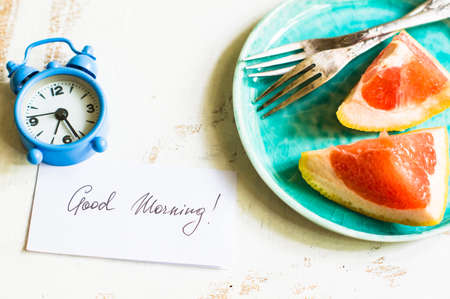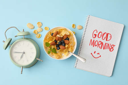 Alarm clock and banner with handwritten phrase good morning on wooden table. Time management concept.