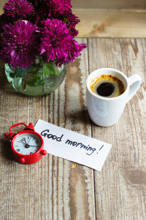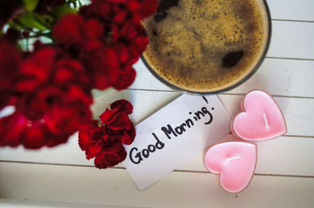 A cup of coffee, a bouquet of flowers and a card with the words good morning.