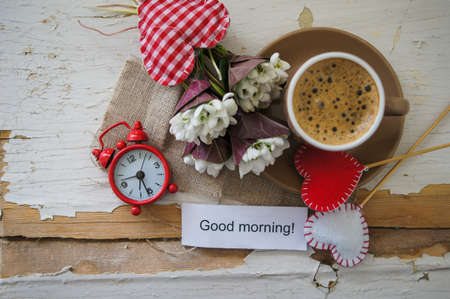 Cup of black coffee and first spring snowdrop flowers on the old table