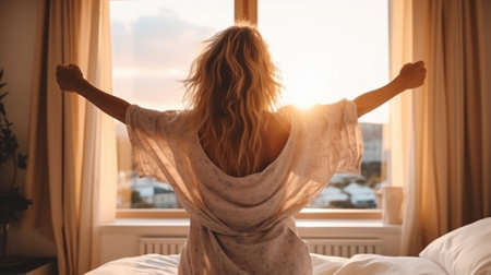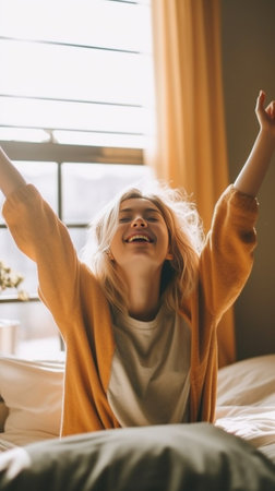 A woman stretches her arms wide in the morning light pouring through a window while standing on a bed in a serene bedroom setting.
