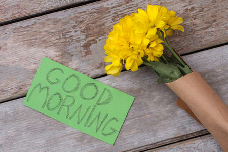 Yellow jerusalem artichoke flowers and good morning note. Top view. Old rustic wooden background.