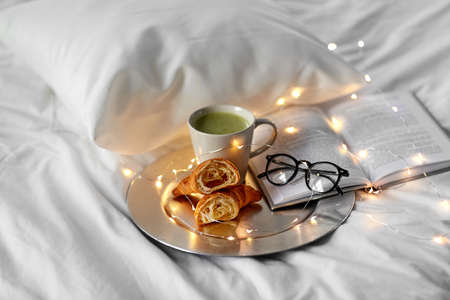 Breakfast served in bed - boiled egg, fresh orange, cookies and coffee, while reading a book. Selective focus. Toned picture