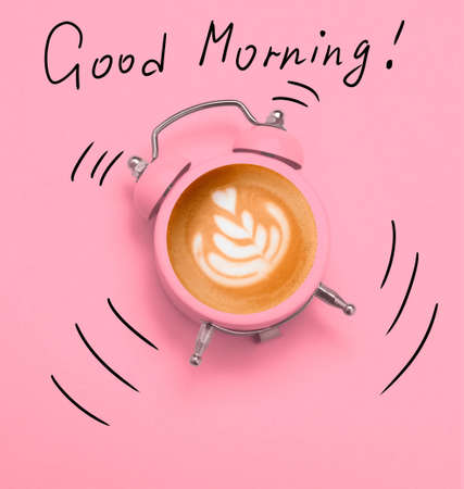 top view coffee with latte art in pink alarm clock on a pink background and dodle good morning