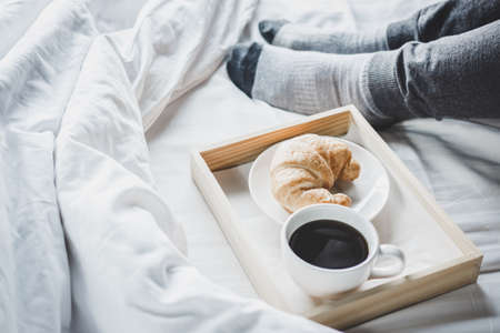Tasty morning coffee in bed with cake and notebook with flowers closeup. Breakfast time.
