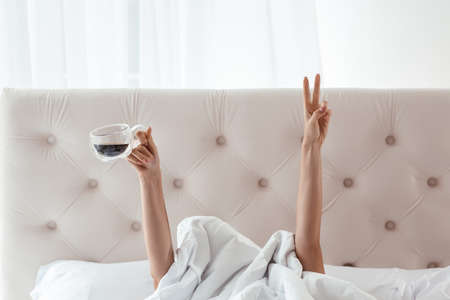 Female hand showing the funny sign and holding cup behind blanket in the bed, Coffee morning concept. two woman hands sticking out from the blanket.