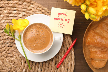 Cup of aromatic coffee with croissant, beautiful yellow freesias and Good Morning note on wooden table, flat lay