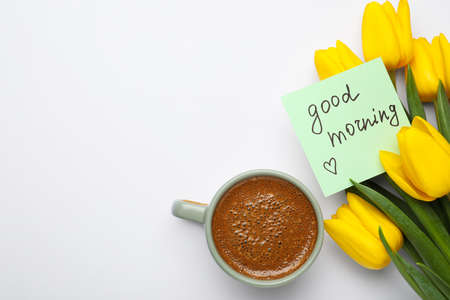 Cup of aromatic coffee, beautiful yellow tulips and Good Morning note on white background, flat lay. Space for text