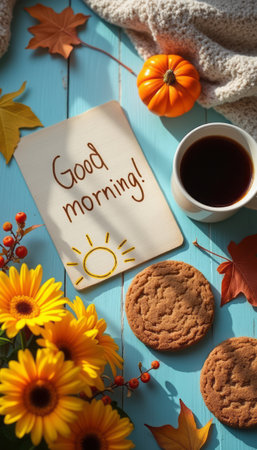 A delightful morning scene featuring a cozy cup of coffee, freshly baked cookies, and vibrant yellow flowers, all set against a bright blue background. The handwritten note saying Good morning adds a personal touch, while autumn leaves and a small pumpkin enhance the seasonal charm.