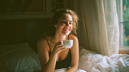 Woman coffee cup morning light bedroom bed window curtain smile relaxed mood woman coffee cup morning light bedroom bed window