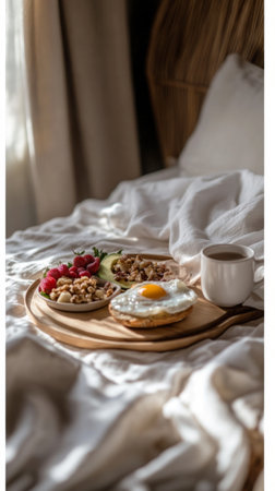 Savoring a delightful breakfast in bed featuring sunny-side-up eggs, fresh berries, and hot coffee on a cozy, lazy morning wrapped in soft blankets