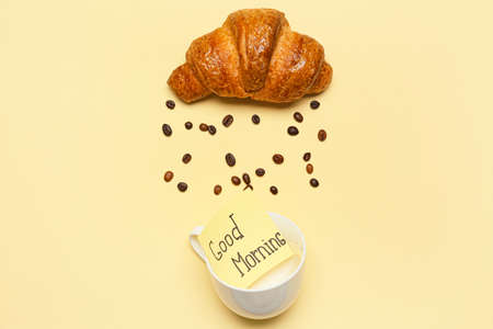 Beautiful composition with croissant, coffee beans, cup and sticky note with text GOOD MORNING on color background