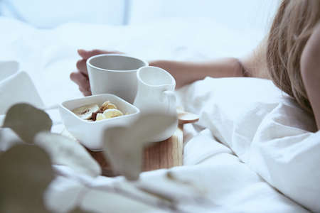 Morning snack. Cottage cheese muffin and tea. Early breakfast. Girl reaging in her bed.